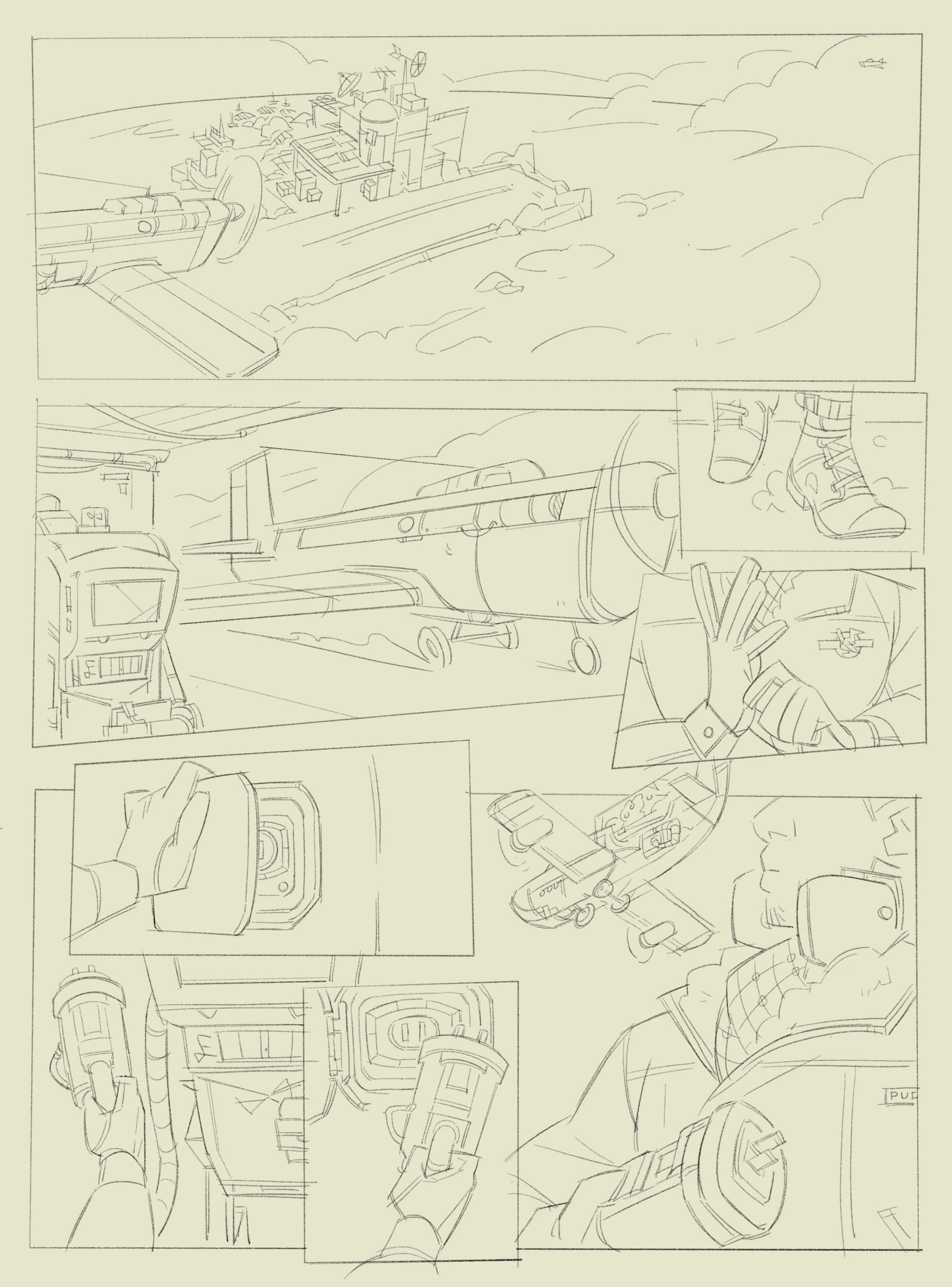 There are other parts of the script which don't survive the drafting process. You'll note in the script that I have power gauges inset into the first panel to highlight how both planes are running low on energy. However, when Vicky's art came through it became clear that those insets would crowd the image, so we went looking for other ways to integrate that message into the page, eventually settling on a more subtle addition of a power gauge in one of the panels later in the page. (Different designs for this can be seen below. Vicky also did some work to make the power socket more 'plug-like' as I wanted to make sure it was clear these planes are flying on energy, not fuel.)