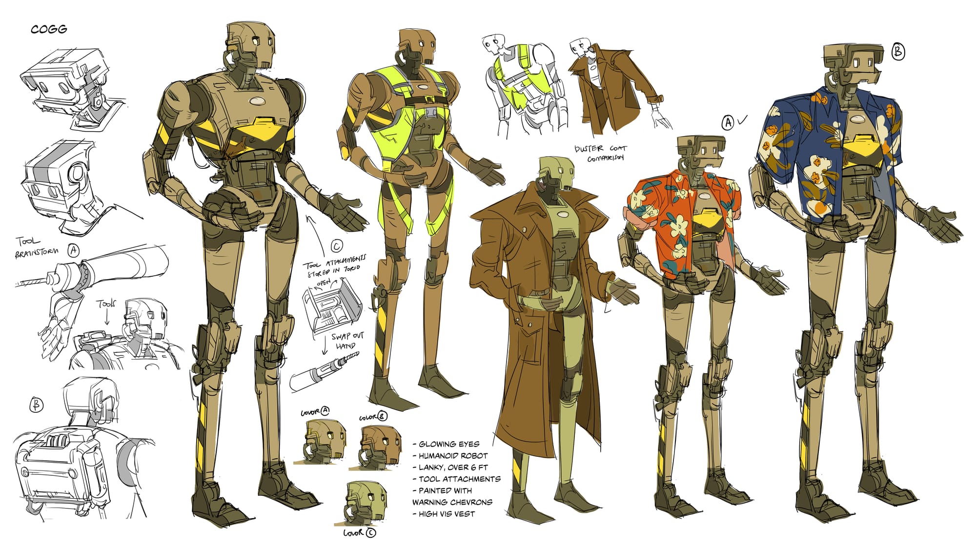 That's right, your eyes are not deceiving you, that's a robot in a Magnum P.I shirt. Vicky's honestly blown me away with her work, and I'm really excited to get these new characters running about the page. The eagle-eyed amongst you may also have noticed there are some younger versions of Melia and Byron in the designs. There's a flashback sequence in the book and that's one of the big things I'm most excited to see Vicky render. I can't wait to share it with you all if the Kickstarter is successful.