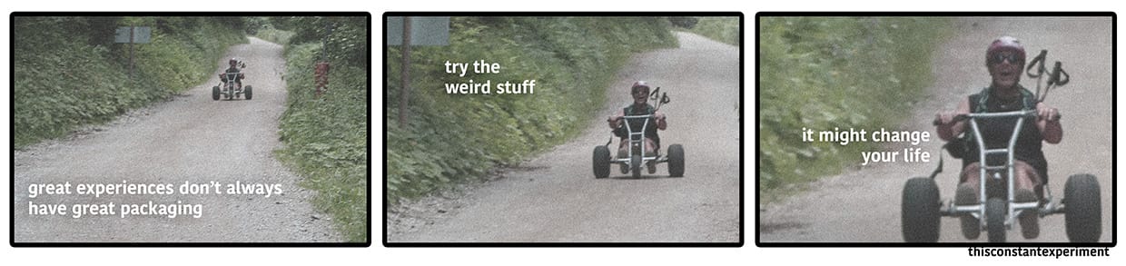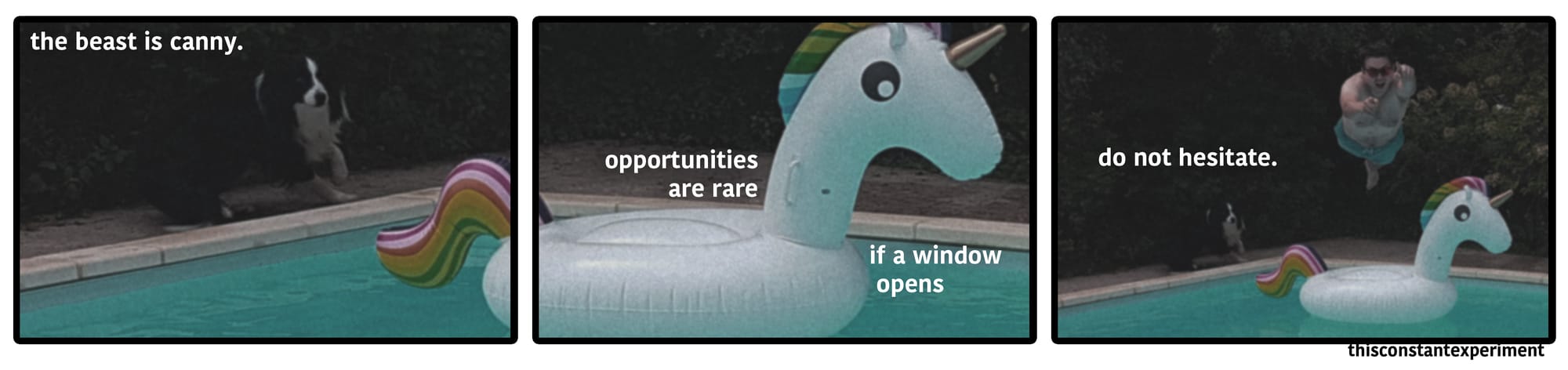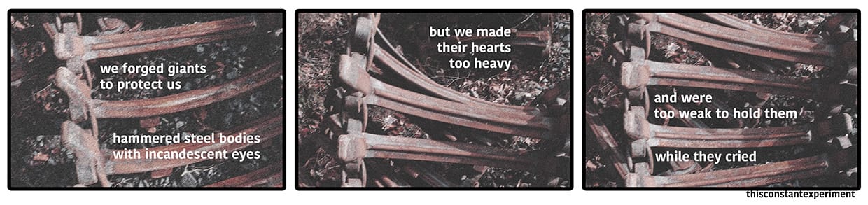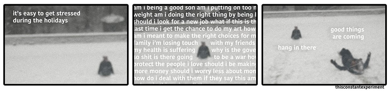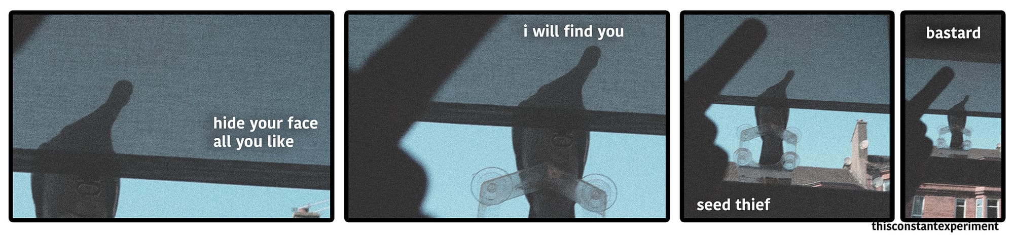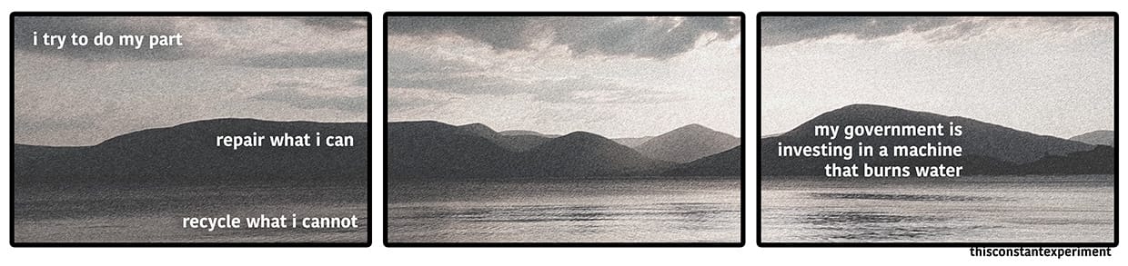 TCE comics are an exercise in solo comic-making. Taking photos I've taken in the world and bounding them within three simple black boxes. Each one is its own combination of daydreaming, fiction, and documentary.