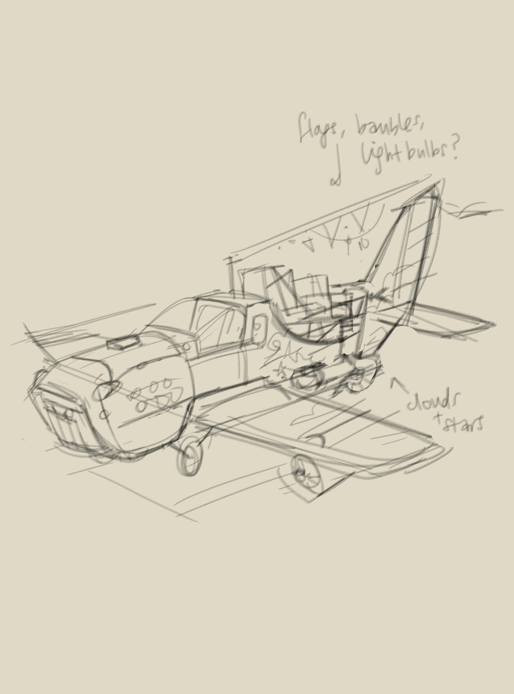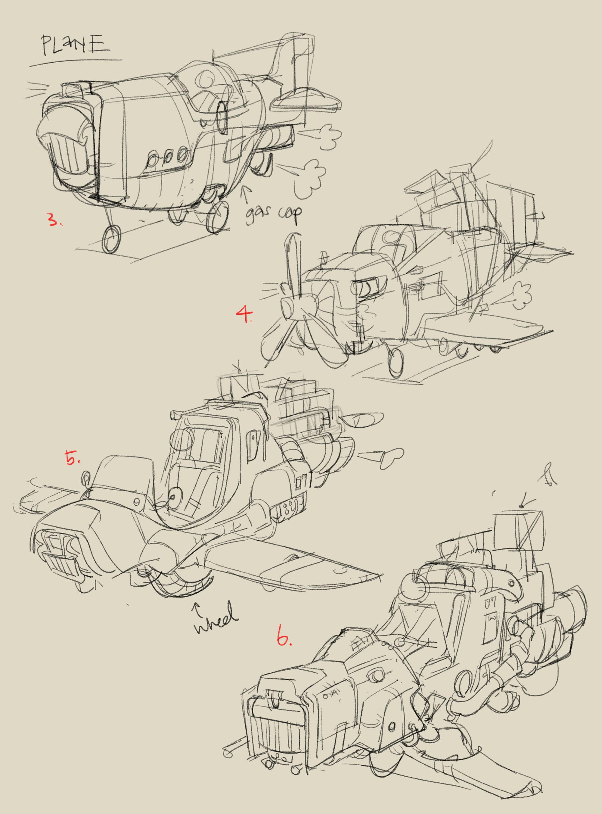 For example: When working up concepts for one of the character's plane (an important extension of their personality) Vicky drew several planes with a line running from the tail to the cockpit. I said it looked cool, and that the pilot in question would probably run some flags along it. Vicky obliged with the second drawing but added light bulbs as well. This immediately made me think of night market stalls and I started to think about how gathered PuddleJumpers could form bright, temporary markets together where they promoted their individual specialities.
