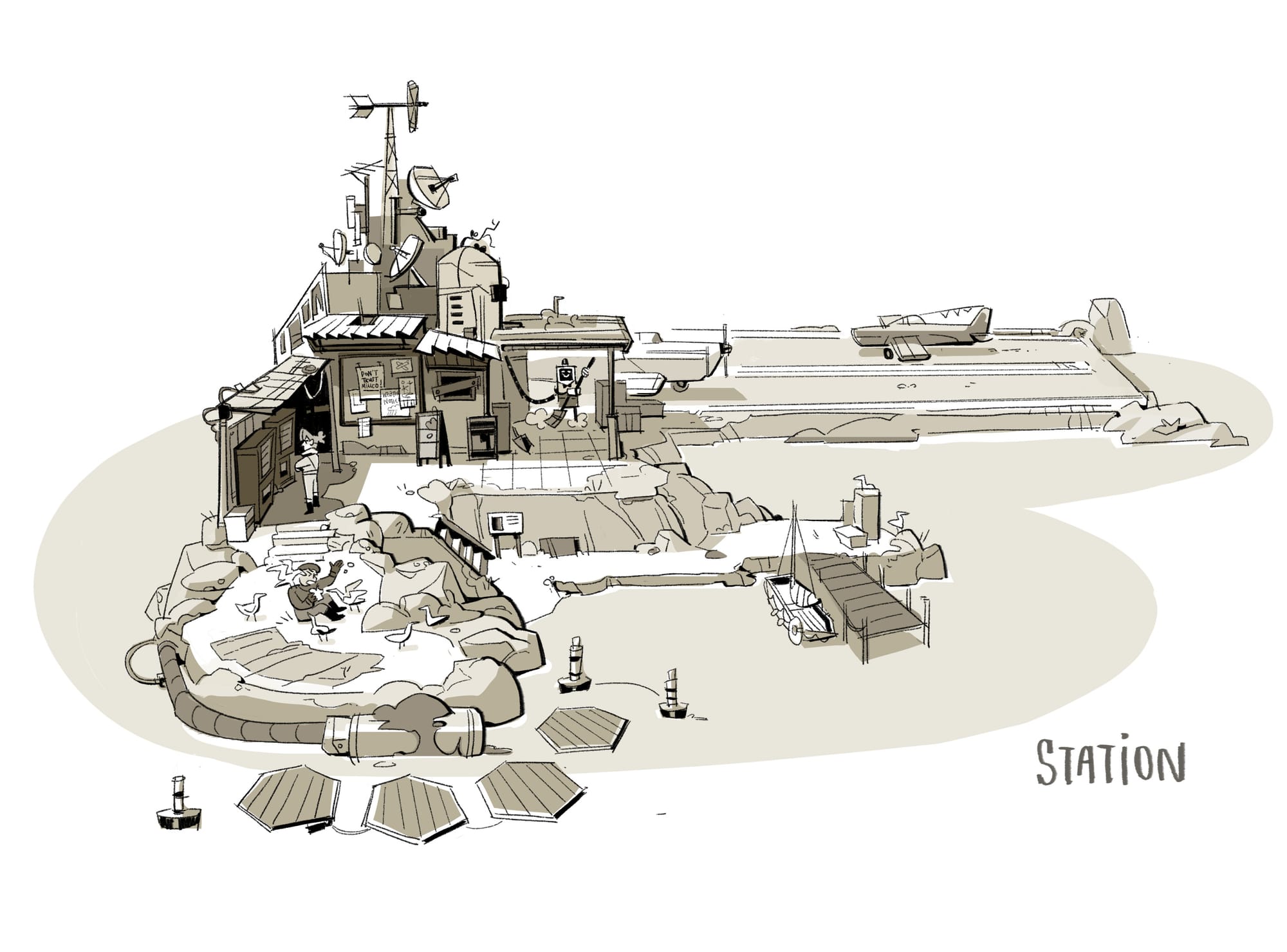 Today I'd like to talk a little bit about how Vicky's concept art has influenced and shaped the way I'm telling the story, particularly how characters are making use of their stage; A little island in the middle of a flooded world.