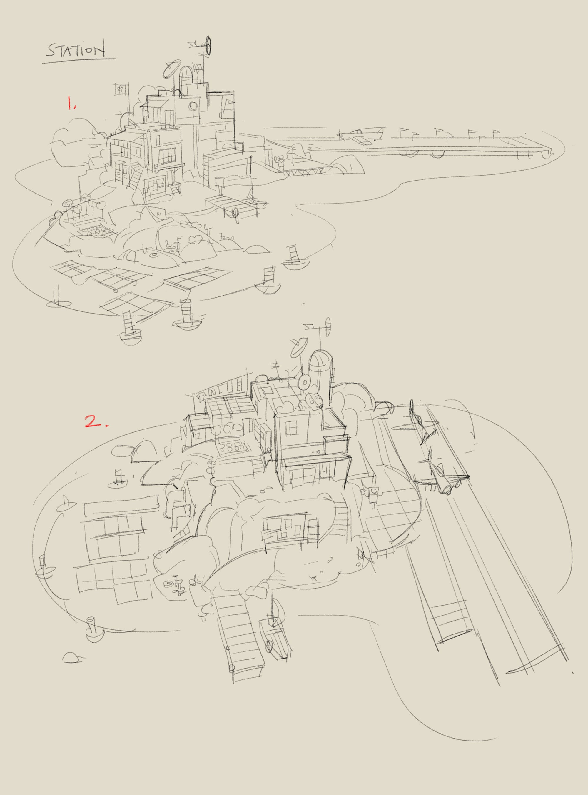 As a learning experience, reviewing and feeding back on concept art is a great chance to see whether the information I'm putting into the script is clear and precise enough. Not in the sense that I want to control where every item in a scene is put, but in the sense that the vibes are right. The first drafts above helped me realise that calling it a 'fuelling station' implied a establishment and in service-ness that I didn't want. This is meant to be a remote spot in the middle of the sea. So I updated the description and made a note to self that I need to refine the way I use descriptions.